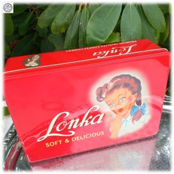 Underbart Vacker plåtburk Lonka Old English Fudge nyproduktion rektangulär Fint