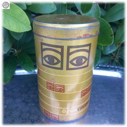 Underbar Mazetti kakburk i gyllene färg och med ögonen som dekor Ögonkakao