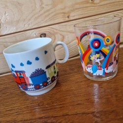 Paret äldre barnporslin/glas, kopp m bondgård, glas m cirkusmotiv, retro