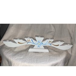 Snidad sjuarmad träljusstake, ljusgrå, dekoration i blå vit gul o guld färg
