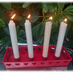Adventsljusstake stansad rödplåt med hjärtan vitmossa Underbar vintage
