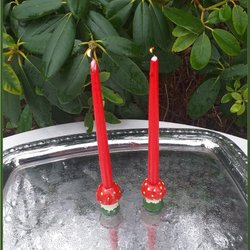 Paret röda hemslöjds ljusstakar välsvarvade vintage Fint skick