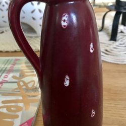 Röd hänkelvas/vas med vita prickar och mörkröda ränder, Strehla Keramik DDR