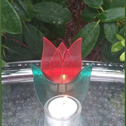 Vacker ljuslykta med röd tulpan i glas - vackert skimmer igenom Fint skick