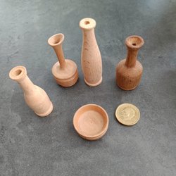 Miniatyrer svarvat trä för prylhylla, dockskåp m.m
