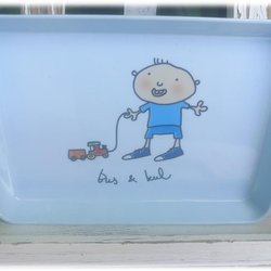 Bus & Kul bricka vit bricka Bruka Design motiv på pojke som drar sitt tåg