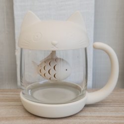 Cat Tea Mug - Glass Infuser Cup with Lid and Fish Strainer - 12 cm