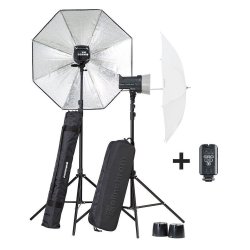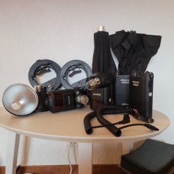 - Ett brett urval av ljusformare, inklusive paraplyer, reflektorer och diffusorer
