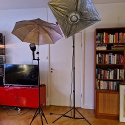 - Olika typer av studiobelysning, från softboxar till spotlights