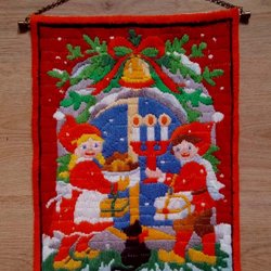 Broderad julvepa med klocka – Tomtar och julgran