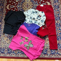 Klädpaket med bla nya byxor, str 122-128