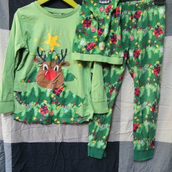 Grön 2 delad pyjamas med julmotiv / ren och julgran & Tomteluva Stl. 110/116