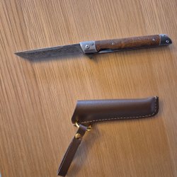 Handgjord samlarkniv i damaskus med fjäderhandtag och läderslida - A0994