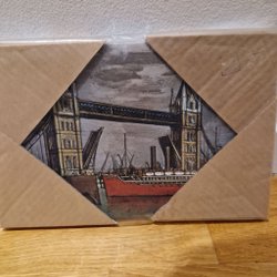 En tavla med motiv av en bro och ett fartyg, tryck på duk