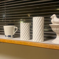 Två vita höga krukor ytterfoder mönster i relief medaljong
