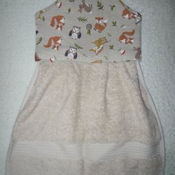 Beige spishandduk med flera av skogens djur, räv, rådjur, uggla, ekorre o svamp