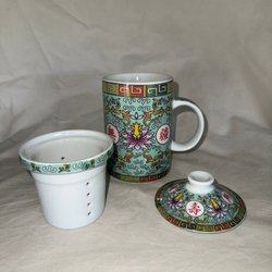 Mugg med praktisk teinsats och lock, asiatiskt motiv