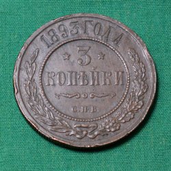 Ryssland 1893 Mynt 3 Kopek Kv.8