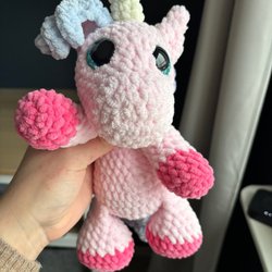 Mjuk handvirkad enhörning snuggler skapad i lent chenillegarn.