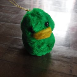 Liten grön anka med gul näbb och hänge