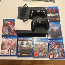 Playstation 4 Slim med spel och handkontroller