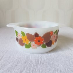 Jena Pyrex i glas med lock - Vintage Schott Mainz Baking.Fat - 70-talsblommor