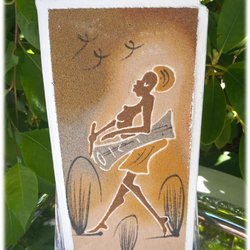 Afrikansk sandtavla på trä märkt TH i vackra jordnära färger vintage VI har fler
