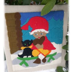 Tomtetavla Långstygnsbroderi väv handarbete tomte med sin sbvarta katt