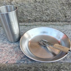 Tallrikslåda, kåsa, fältflaska, campingset