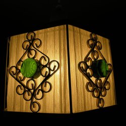Retro taklampa i mässing, spetstyg och grönt glas
