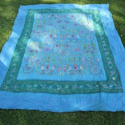 Stor Blå broderad Väggbonad Duk sängöverkast med fåglar och blommor