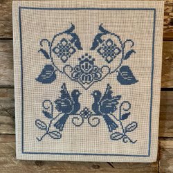 29x32 cm Vintage Broderad tavla Vita och blå fågelbroderier, handgjorda