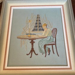 Tavla handbroderad med vit träram.