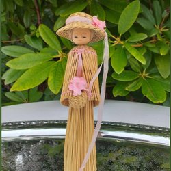 Halmdam halmdocka flätad med korghatt rosa blomma charm Karaktär Handgjord