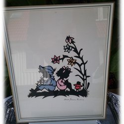 Silhuetmaleri med børn, der sidder ryg mod ryg med blomster 50'er vintage