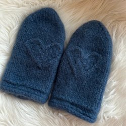 Blå håndstrikkede og tovede vanter/luffer m hjerte/håndstrikket uldvante