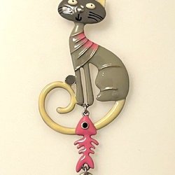 Halsbånd Kat med Fiskeben Rosa / grå / hvid emaljeret vedhæng Ny! Julegave?