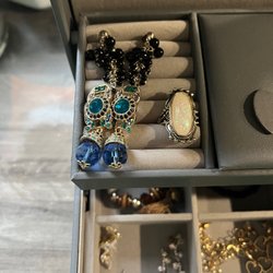 Smykkeskrin med forskellige øreringe og armbånd