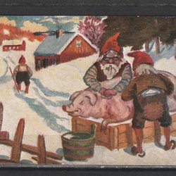 Norge. Julekort med Nisser og Gris. .. Sign. SK