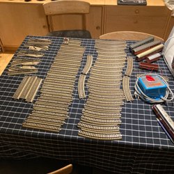 Märklin modeltog med lokomotiv, vogne, skinner og tilbehør