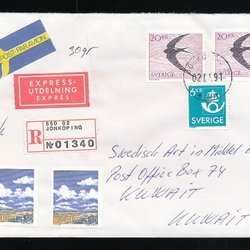 KUWAIT: Smuk EXPRESS/REK kuvert til KUWAIT.02.01.91.RETUR afs. i JÖNKÖPING