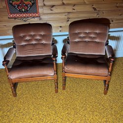 2 brune lænestole i træ og fløjl