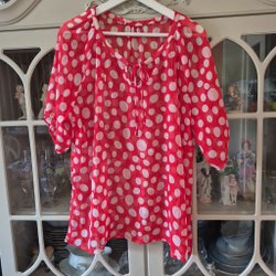 Rød damebluse med hvide prikker i transparent stof str. 46