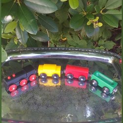 Trætog et lokomotiv i sort med 3 vogne på magneter God stand