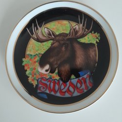 Dekorativ Tallrik porslin - Sweden - Älg Motiv med målad guldkant Diam: 19 cm
