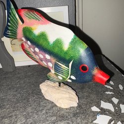 Figur af en siddende mand, der mangler sin fiskestang