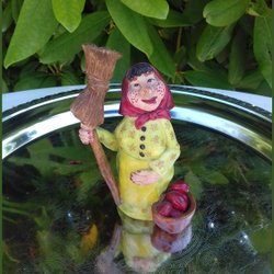 Heks eller påskehare med en keramisk kost og en kurv med frugt Fremragende stand