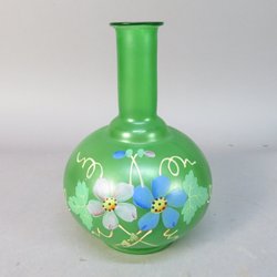 Glaskaraff/vas i grönt med handmålad dekor av blommor