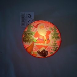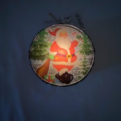 Strålende LED-nisse med snor. Juletræspynt. 9 cm i diam. 3 cm tyk. Fr æld butik