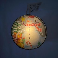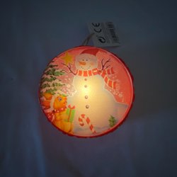 Lysende LED snemand med snor. Juletræspynt.:9 cm i diameter. 3 cm tyk.Fr but